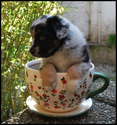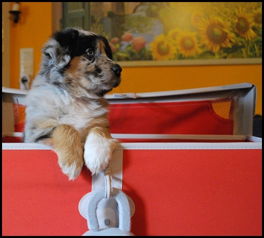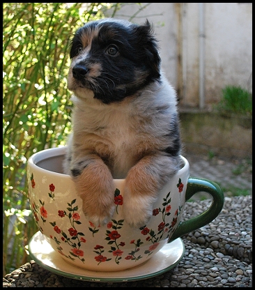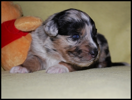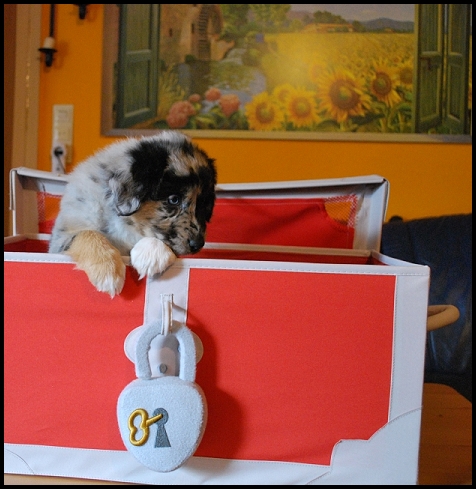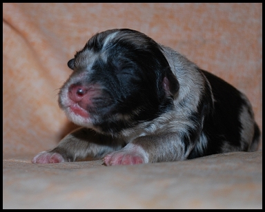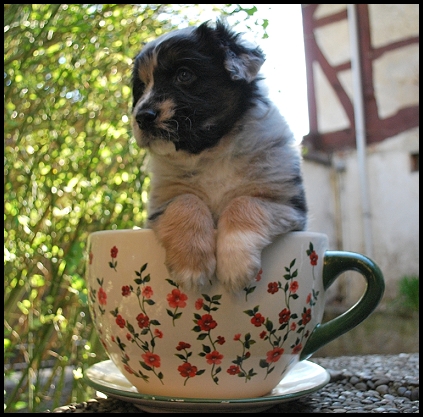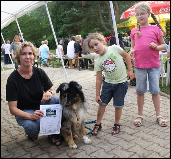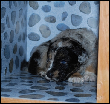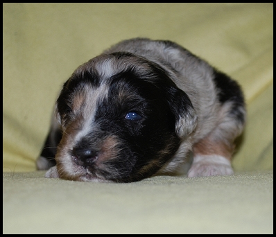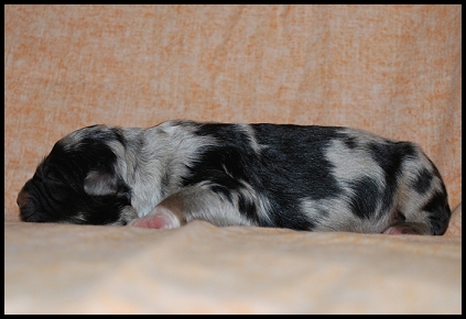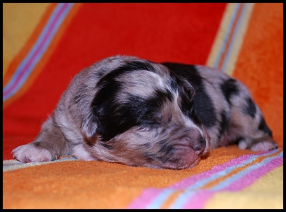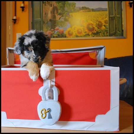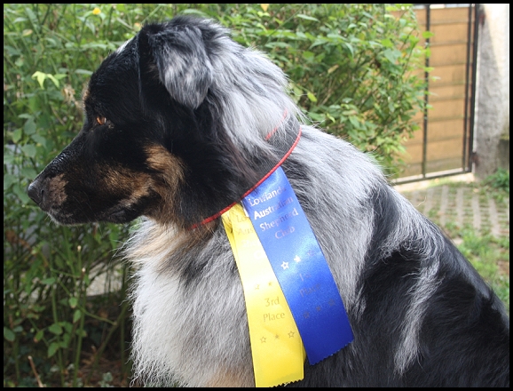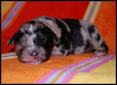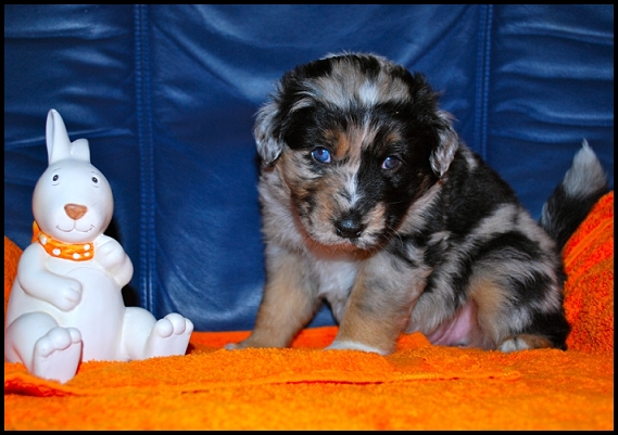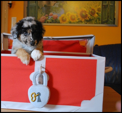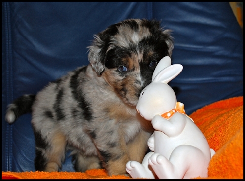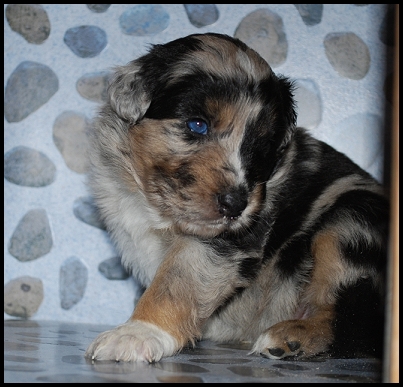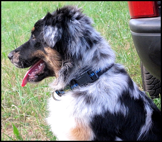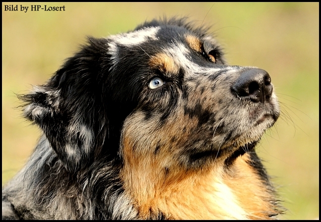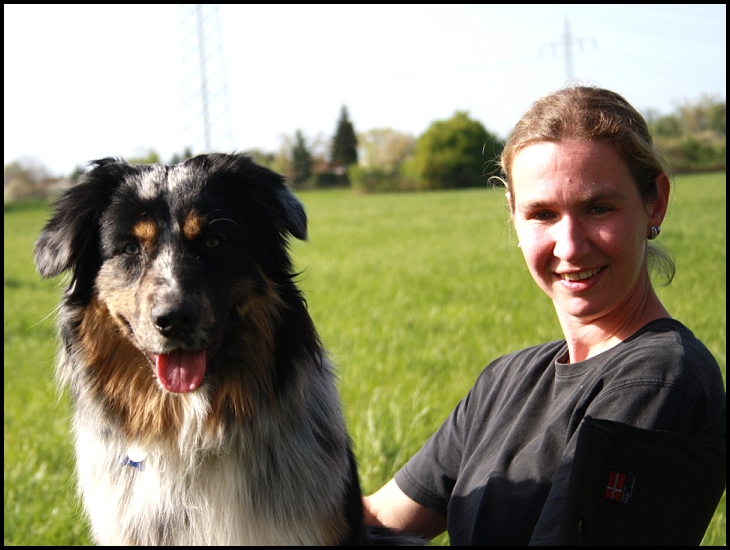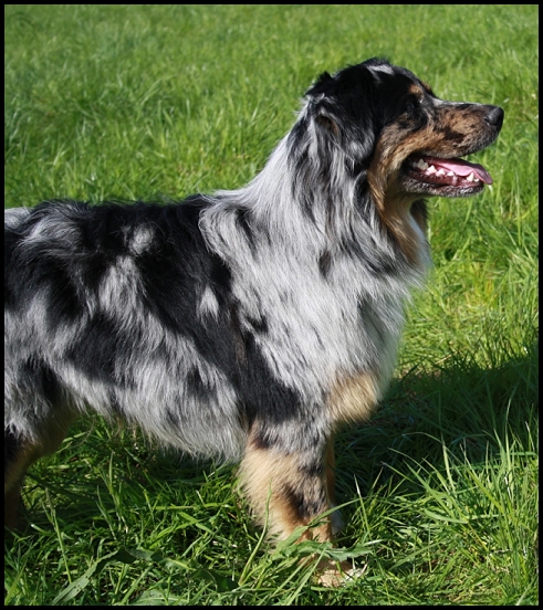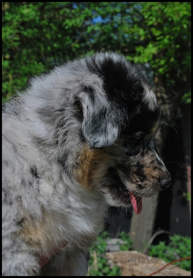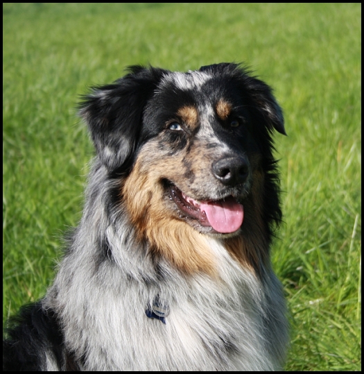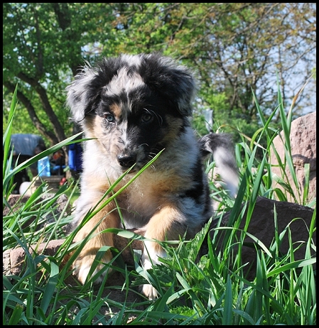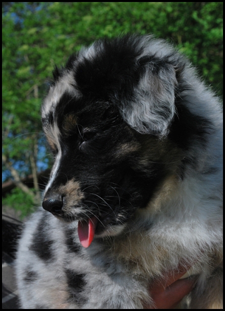 (: Und ein drolliger Kerl. Mit seiner dunklen und aussergewöhnlichen Merle-Zeichnung ist er ein richtigter Hingucker. Er hat erfolgreich die BH absolviert wird ind THS gearbeitet und wurde auch bei seiner ersten